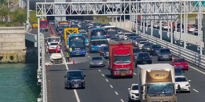 10月3日14时09分,深中通道路网调度中心监控员通过事件检测系统,发现一辆粤Q牌小车异常停靠在深圳往中山方向隧道出口处应急车道,车头冒烟,随即窜出明火并快速增大。现场车来车往,情况十分紧急。路网调度中心立即通知路政、交警、消防、拯救、养护等单位前往处置。