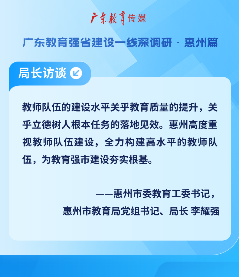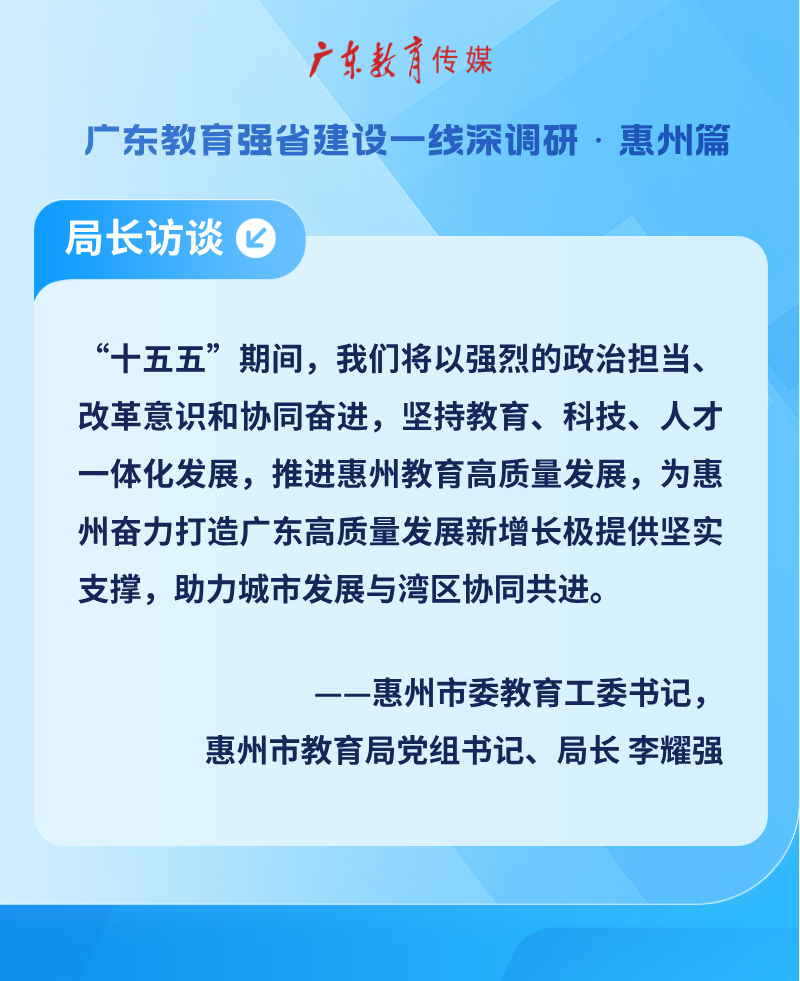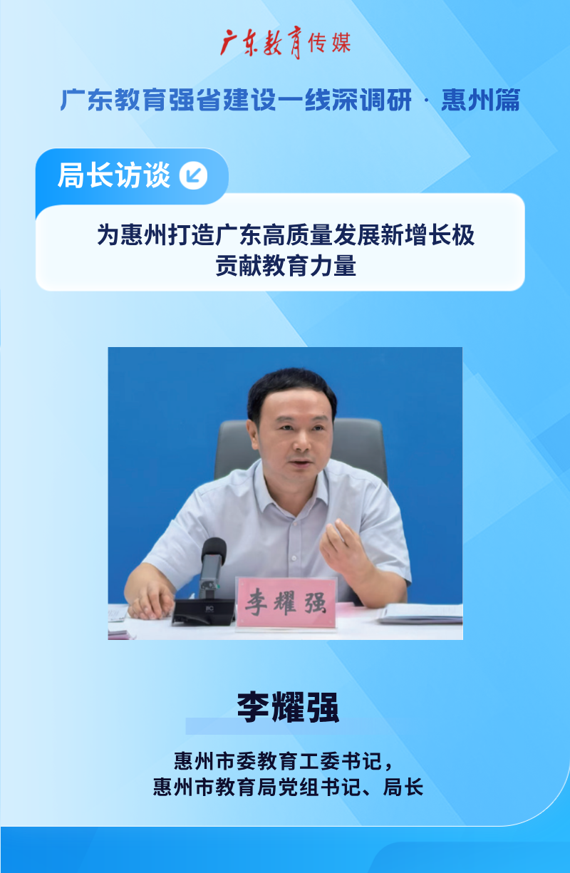 “广东教育传媒”推出“聚基层力量,以实干破题——广东教育强省建设一线深调研”专题,力图呈现教育生态的深刻变革,聚焦制度创新的底层逻辑——通过挖掘改革样本,系统梳理区域试点的突破性经验,推动基层智慧向制度成果转化,立体呈现新时代教育现代化建设的广东路径和生动实践。本期,听惠州市委教育工委书记,惠州市教育局党组书记、局长李耀强谈谈如何为惠州打造广东高质量发展新增长极贡献教育力量。