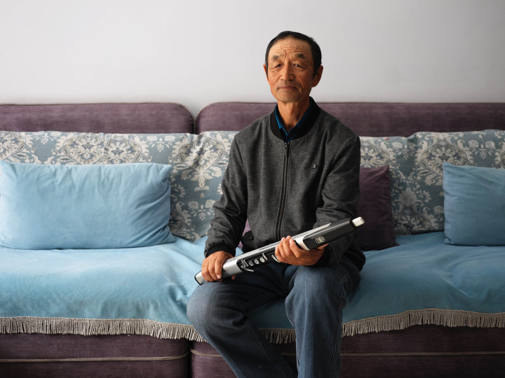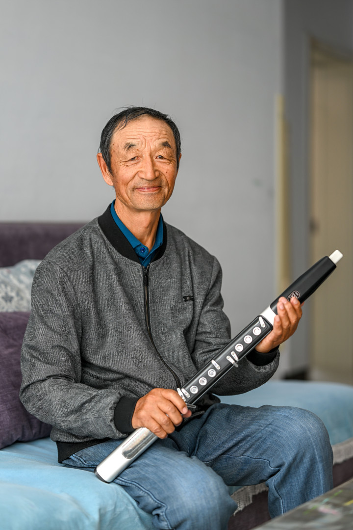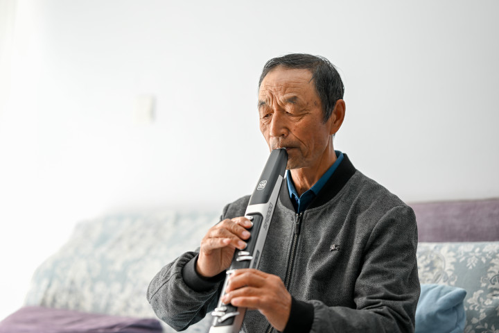 一位老人坐在沙发上多多策略,手持电子笛,神情专注。手指跳动间,一首《国家的孩子》歌曲悠扬响起。