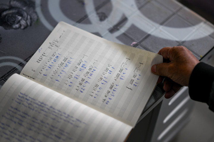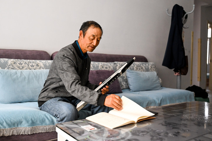 9月25日,在内蒙古锡林郭勒盟苏尼特右旗,其木德在家中翻看自己谱写的乐谱。新华社记者 李志鹏 摄